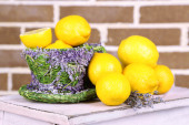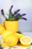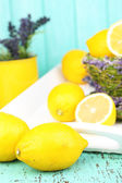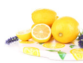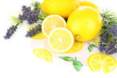 Martwa natura z świeżych cytryn i lawendy, na białym tle