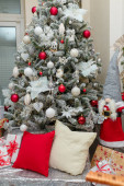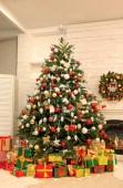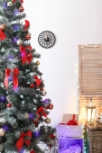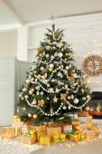Piękna choinka z gwiazdą topper w urządzonym pokoju