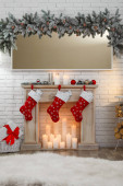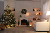 Piękne Boże Narodzenie tematyczne zdjęcie strefy z kominkiem i dekoracji jodły