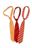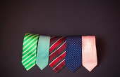 Stylowe czerwone, niebieskie i różowe krawaty na ciemnym tle. Widok z góry, przestrzeń kopiowania.