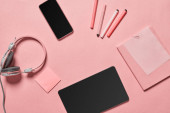 Smartfon i bezprzewodowe słuchawki stereo na różowym niebieskim pastelowym tle. Widok z góry