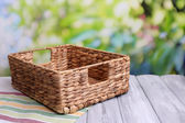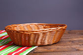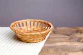 pusty wiklinowy koszyk na drewnianym stole, na ciemnym tle