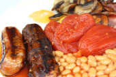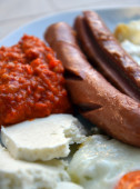 apetyczne śniadanie z jajka sadzone smażone jajka i smażone kiełbaski