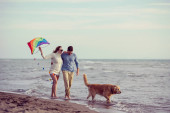 szczęśliwa rodzina bawi się z psem na plaży