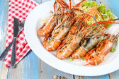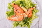 Krewetki gotowane na talerzu owoce morza restauracja świeże krewetki ze składnikami warzywa sałatkowe