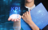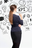 Biznes, technologia, internet i koncepcja sieci. Młody przedsiębiorca zastanawia się nad etapami pomyślnego wzrostu: KPI