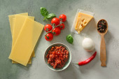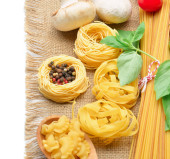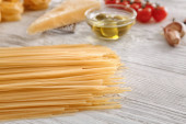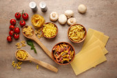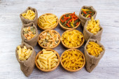 Worki z niegotowanym makaronem i warzywami na drewnianym tle