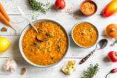 Zdjęcie "Kuchnia turecka. Tradycyjna zupa z ryżem, soczewicą i miętą na rustykalnym stole. Widok z góry płaski. Przestrzeń kopiowania" może być wykorzystywane do celów osobistych i komercyjnych zgodnie z warunkami zakupionej licencji Royalty-free. Obraz jest dostępny do pobrania w jakości wysokiej rozdzielczości do 5760x3840.