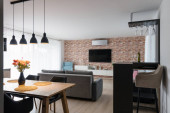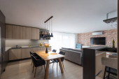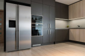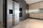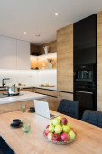Zdjęcie "Stół jadalny w kuchni nowoczesnego domu" może być wykorzystywane do celów osobistych i komercyjnych zgodnie z warunkami zakupionej licencji Royalty-free. Obraz jest dostępny do pobrania w jakości wysokiej rozdzielczości do 5760x3840.