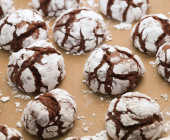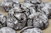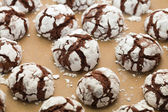 Zimowy wypiek świąteczny - ciasteczka czekoladowe z cukrem pudrem na tacy piekarniczej pokrytej pergaminem