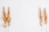 Martwa natura bukietu suszonych kwiatów w szklanej butelce na drewnianym stole. Miejsce na tekst lub reklamę.