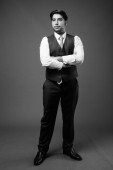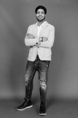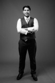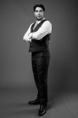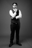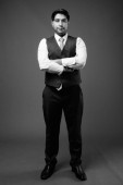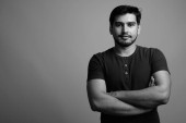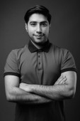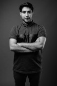 Studio zdjęcie młodego przystojnego Irańczyka w szarej koszuli na brązowym tle