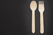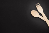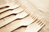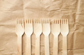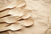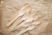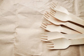 ekologiczne jednorazowe przybory kuchenne na papierowym tle. Spójrz z góry. drewniane widelce. koncepcja przyjazna środowisku.