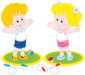 Zdjęcie "Wesoły słodkie dzieci w kolorowe stroje sportowe robi ćwiczenia na dużych piłek fitness w gimnastycznej lekcji, wektor ilustracji kreskówki izolowane na białym tle" może być wykorzystywane do celów osobistych i komercyjnych zgodnie z warunkami zakupionej licencji Royalty-free. Obraz jest dostępny do pobrania w jakości wysokiej rozdzielczości do 5760x3840.