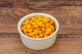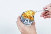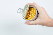 Drewniana łyżka pełna nasion popcornu na białym tle
