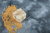 Łyżka słodkich kukurydzy i papryki zbożowej na marmurowym tle