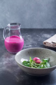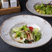 Szef kuchni uzupełnia sałatkę gotowania i dodać z białym sosem do czerwonych ryb i warzyw.