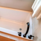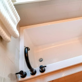 Zdjęcie "Prostokątny zbudowany w wannie z czarnym zakrzywionym kranem wewnątrz łazienki w domu" może być wykorzystywane do celów osobistych i komercyjnych zgodnie z warunkami zakupionej licencji Royalty-free. Obraz jest dostępny do pobrania w jakości wysokiej rozdzielczości do 5760x3840.