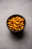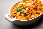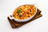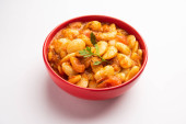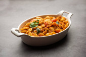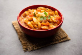 Podwójna fasola curry, sabzi lub sabji przepis wykonany przy użyciu podstawowych indyjskich przypraw i świeżych pomidorów, podawane w misce. ukierunkowanie selektywne