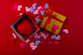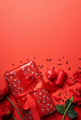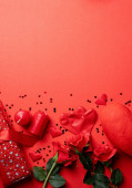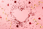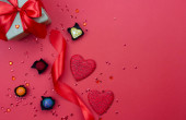 Walentynki tło ze świecami, prezenty, serca i confetti widok górny płaski leżał na różowy. Przestrzeń kopiowania