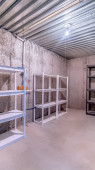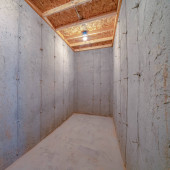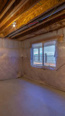 Wnętrze pomieszczenia w budowie z drewnianymi belkami pod ścianą betonową