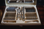 wiele czystych noży stalowych leży w rzędzie na obrusach w restauracji z talerzami na tle