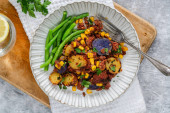 Tradycyjny węgierski gulasz z plackiem ziemniaczanym i śmietaną