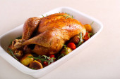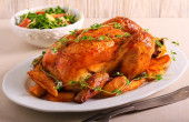 Pieczony cały kurczak podawany na talerzu z warzywami