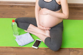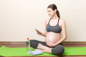 Ciężarna kobieta trzyma smartfona podczas siedzenia na macie do jogi w domu w czasie koronawirusu.