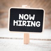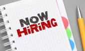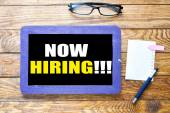 TERAZ HIRING tekst napisany na małej tablicy. Pojęcie przedsiębiorstwa