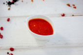 Herbata ziołowa grejpfrutowa z przyprawami i miodem w szklanym kubku na szarym tle, czerwony napój gorący z pomarańczą, tradycyjny japoński napój