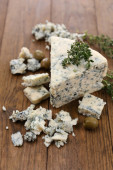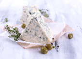 smaczny ser pleśniowy z tymiankiem i oliwki na drewnianym stole