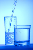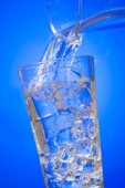wlać wodę z dzbanka do szkła, na ciemnym niebieskim tle