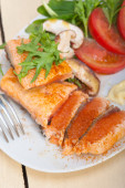 Pan przyjaciel łosoś ryba filet w biały trójkątny płytka łyżka na rustykalnym tle drewna