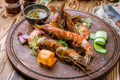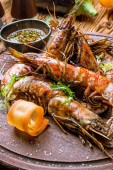 Owoce morza grillowane na talerzu na szarym betonie