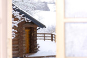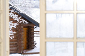 Drewniana chatka z drewna w zimową noc. Dom na wsi w zimowy wieczór może być używany jako pocztówka, tapety lub plakat