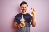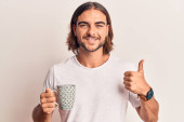 Zdjęcie "Młody przystojny mężczyzna trzyma kawę uśmiechając się szczęśliwy wskazując ręką i palcem na bok " może być wykorzystywane do celów osobistych i komercyjnych zgodnie z warunkami zakupionej licencji Royalty-free. Obraz jest dostępny do pobrania w jakości wysokiej rozdzielczości do 5760x3840.