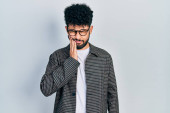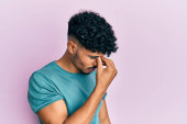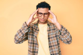Młody, afrykański Amerykanin z afro włosami ubrany w luźne ubrania z ręką na głowie, ból głowy, ponieważ stres. migrena.