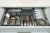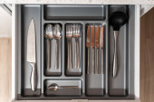 Otwarta szuflada z zestawem narzędzi ze stali nierdzewnej. Zamówienie w kuchni