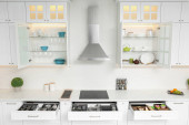 Otwarte szuflady z różnymi naczyniami w kuchni