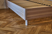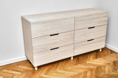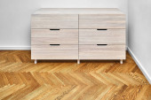 Elegancka skrzynia szuflad wykonana z bielonego drewna litego dębu z szufladami z wyciągiem palcowym stoi na parkiecie bloku drewna w jasnym pomieszczeniu