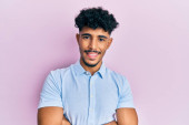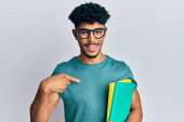 młody arabski przystojny mężczyzna nosi okulary i trzyma książki myśląc nastawienie i trzeźwy wyraz twarzy patrząc pewny siebie