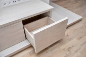 Współczesna skrzynia szuflad wykonana z drewna litego bielonego dębu z otwartą szufladą na parkiet w pomieszczeniu zbliżenie