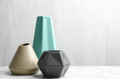 Stylowe puste ceramiczne wazony na białym marmurowym stole, miejsce na tekst