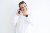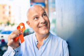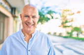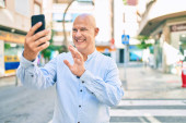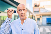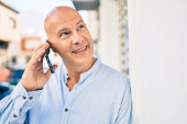 Łysy mężczyzna w średnim wieku uśmiecha się szczęśliwy rozmawiając na smartfonie w mieście.