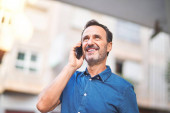 Zdjęcie "Łysy mężczyzna w średnim wieku uśmiecha się szczęśliwy rozmawiając na smartfonie w mieście." może być wykorzystywane do celów osobistych i komercyjnych zgodnie z warunkami zakupionej licencji Royalty-free. Obraz jest dostępny do pobrania w jakości wysokiej rozdzielczości do 5760x3840.