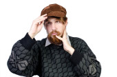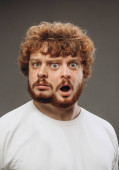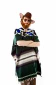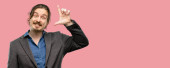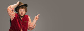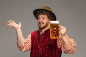 Szczęśliwy uśmiechnięty mężczyzna ubrany w tradycyjny austriacki lub bawarski kostium gestykulując izolowane na szarym tle studio