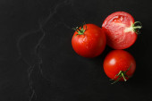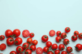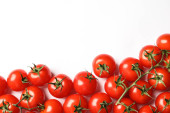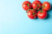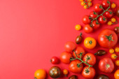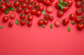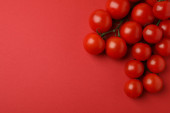 Gałąź z pomidorami wiśniowymi na czerwonym tle, widok z góry. Miejsce na tekst