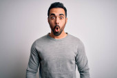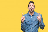 Młody Latynos ubrany w luźne ubrania zdumiony i zaskoczony patrząc w górę i wskazując palcami i podniesionymi ramionami.