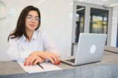 Szczęśliwa uśmiechnięta bizneswoman w pracy rozmawiająca przez telefon, siedząca w biurze, kopiująca przestrzeń